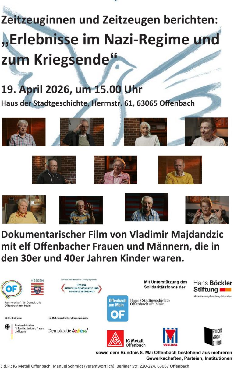 Termin: Sonntag, 19. April 15 Uhr, Der im Sommer 2025 gedrehte Dokumentarfilm von Vladimir Majdandzic im Auftrag des Bündnisses 8. Mai mit 11 Interview-Partner*innen wird noch einmal gezeigt. Ort: Haus der Stadtgeschichte, Herrnstraße 61, Haupteingang unter dem Glasdach Der…