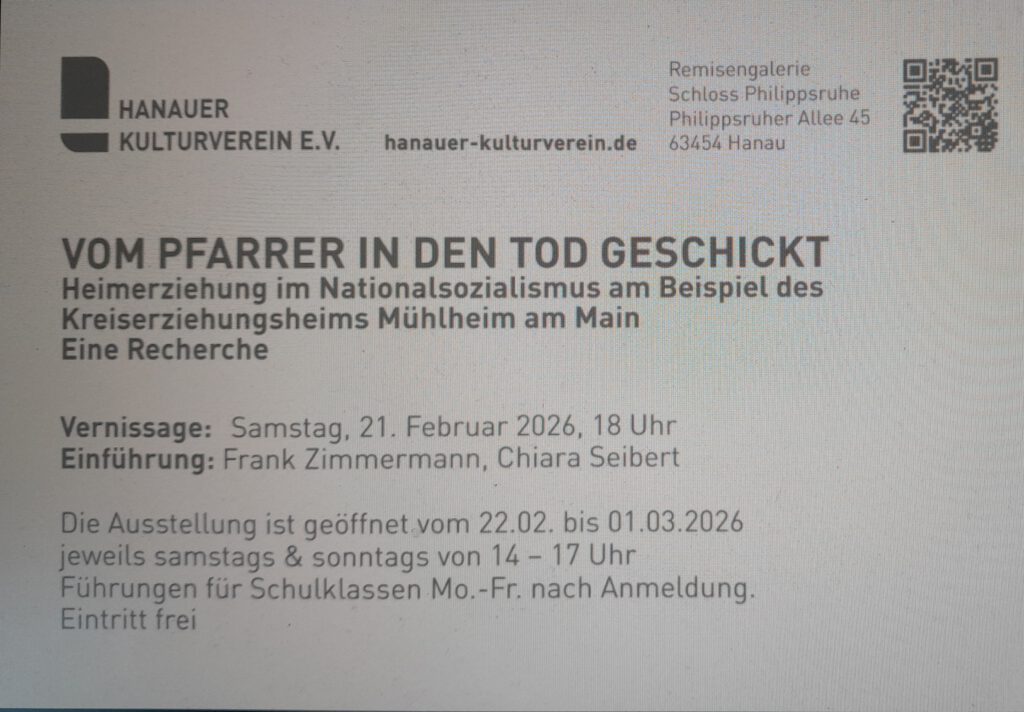 Ausstellung zum Kreiserziehungsheimadmin2. Februar 2026Uncategorized Die im letzten Jahr in Mühlheim entstandene Ausstellung zum Kreiserziehungsheim wird vom 22. Februar bis zum 1. März 2026 im Hanauer Kulturverein gezeigt. Näheres lesen Sie hier: